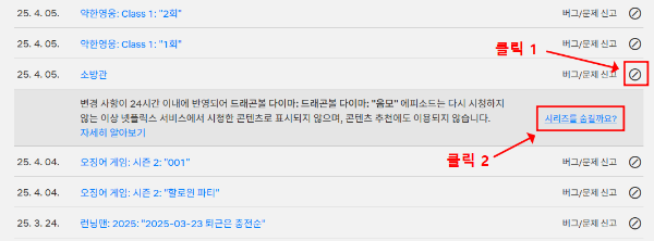 4. 삭제할 콘텐츠 옆에 있는 숨기기 아이콘(🚫) 클릭