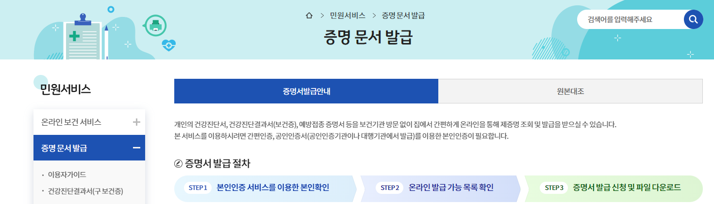 보건복지부와 한국사회보장정보원이 운영하는 온라인민원 서비스,건강진단결과서(구 보건증) 등 제증명 발급, 의료비지원 등 안내