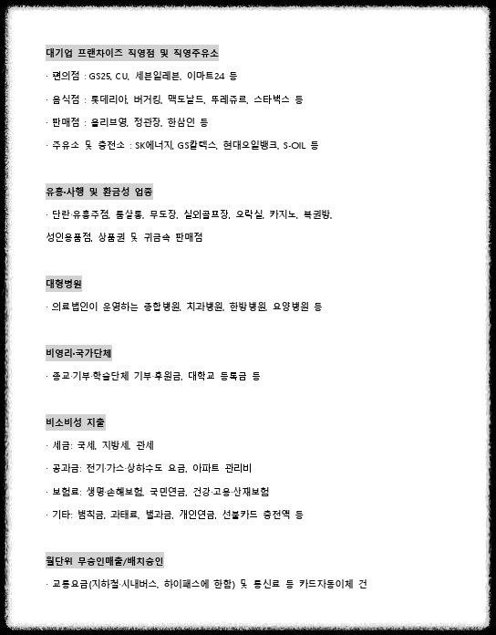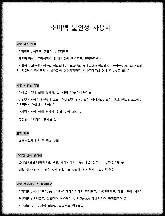 - 인정: 전통시장, 소상공인 가맹점, 개인 운영 주유소 등.