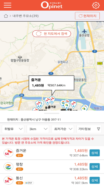 원하는 지역 또는 현재 위치를 기준으로 주유소 리스트 확인.