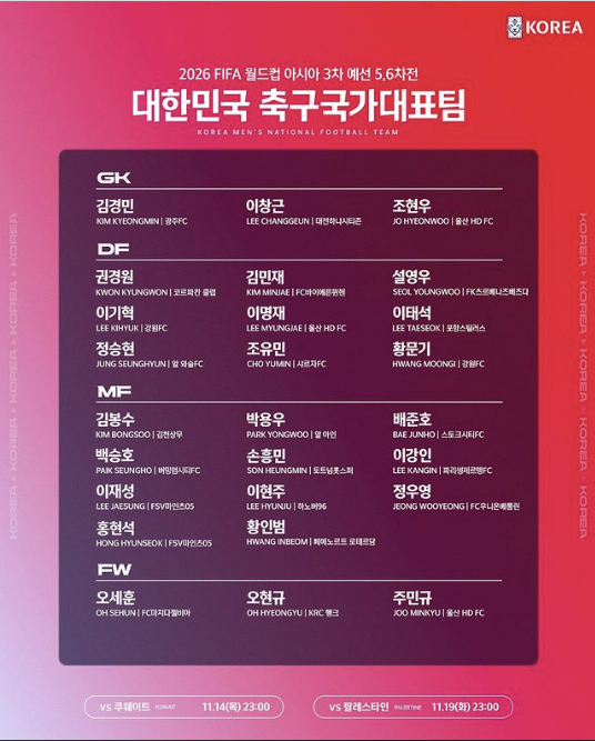 - 오현규: 지난 A매치 2경기에서 연속 골을 기록하며 좋은 흐름을 이어가고 있습니다.