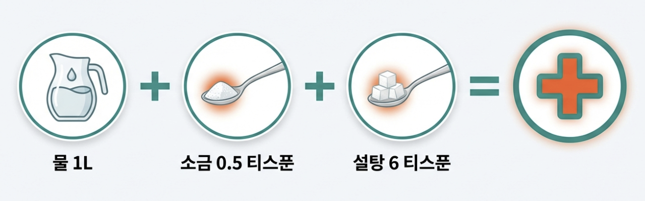 - 가장 영리한 선택: 이온음료도 좋지만 당분이 너무 많으면 설사를 유도할 수 있습니다. 가장 좋은 건 약국에서 파는 '경구수액제' 혹은 물 1리터에 소금 반 티스푼, 설탕 6티스푼을 섞은 자가 수액입니다.