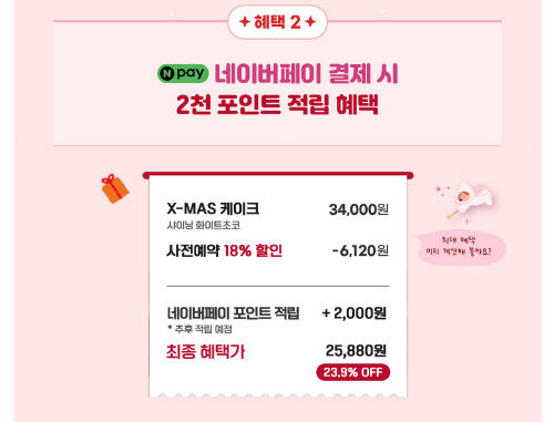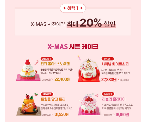 | 파리바게트 | 11.20 ~ 12.19 | 12.21 ~ 12.25 | 최대 30% 할인, 다양한 앱 추가 할인 | 해피오더, 파바앱, 땡겨요 등 | 블레싱 레드베리: 35,000 → 28,000 |