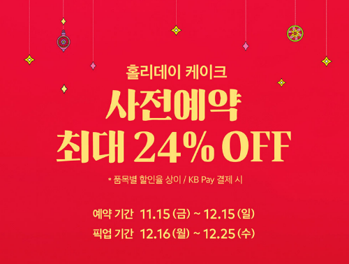 | 투썸플레이스 | 11.15 ~ 12.15 | 12.16 ~ 12.25 | 최대 24% 할인, KB Pay 추가 할인 | 투썸하트 앱 | 화이트 스초생: 38,000 → 34,200 |
